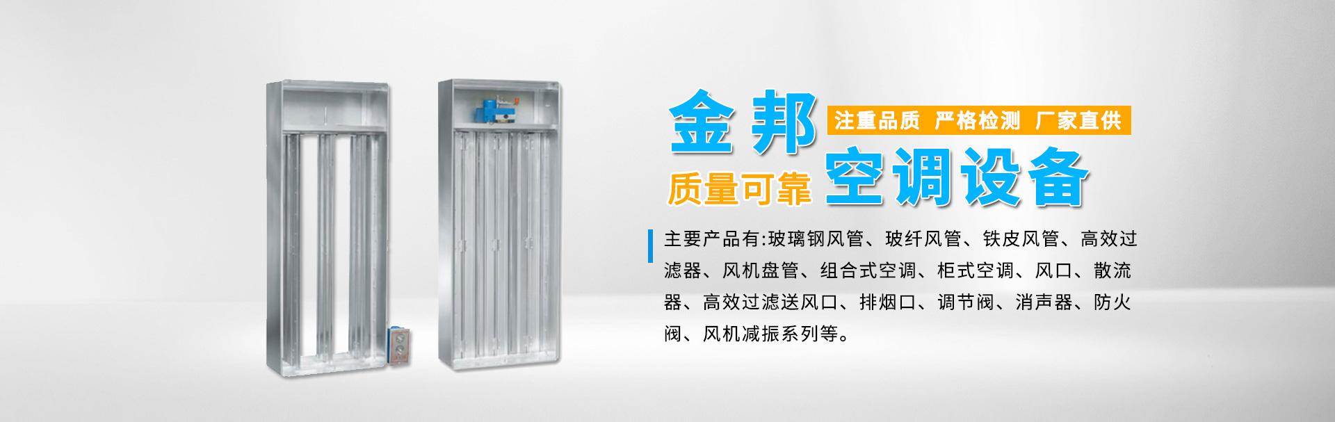 江蘇金邦空調設備制造有限公司專業生產玻璃鋼風管、玻纖風管、鐵皮風管、高效過濾器、風機盤管、組合式空調、柜式空調、風口、散流器、高效過濾送風口、排煙口、調節閥、消聲器、防火閥、風機減振系列等產品